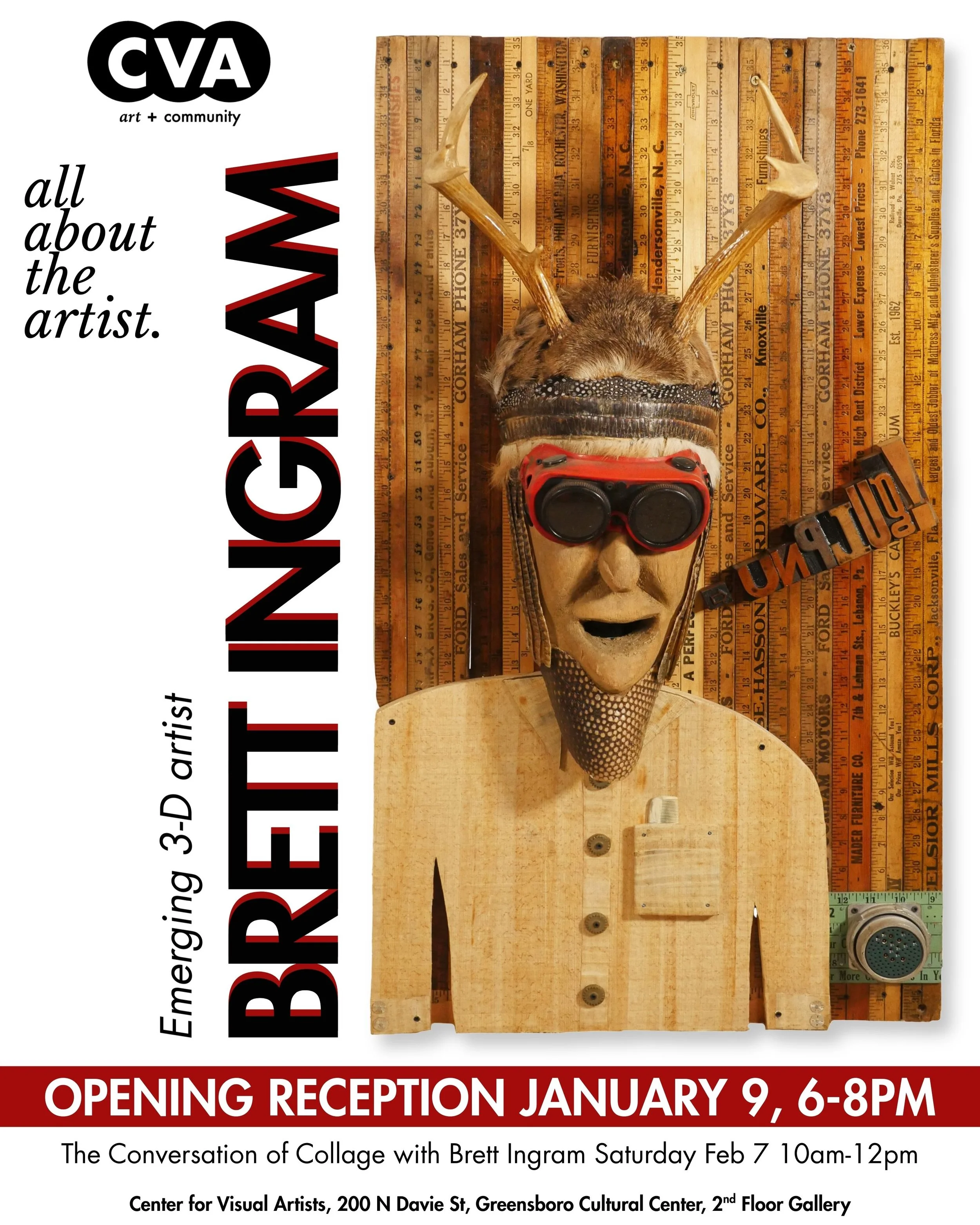 My first solo show (or show, for the matter) of the assemblage art I’ve created since the covid lockdown opened Friday, January 9, 2026 from 6-8pm in the CVA (The Center for Visual Arts) gallery on the 2nd floor of the Greensboro Cultural Center (200 E.Davie St., Greensboro, NC).